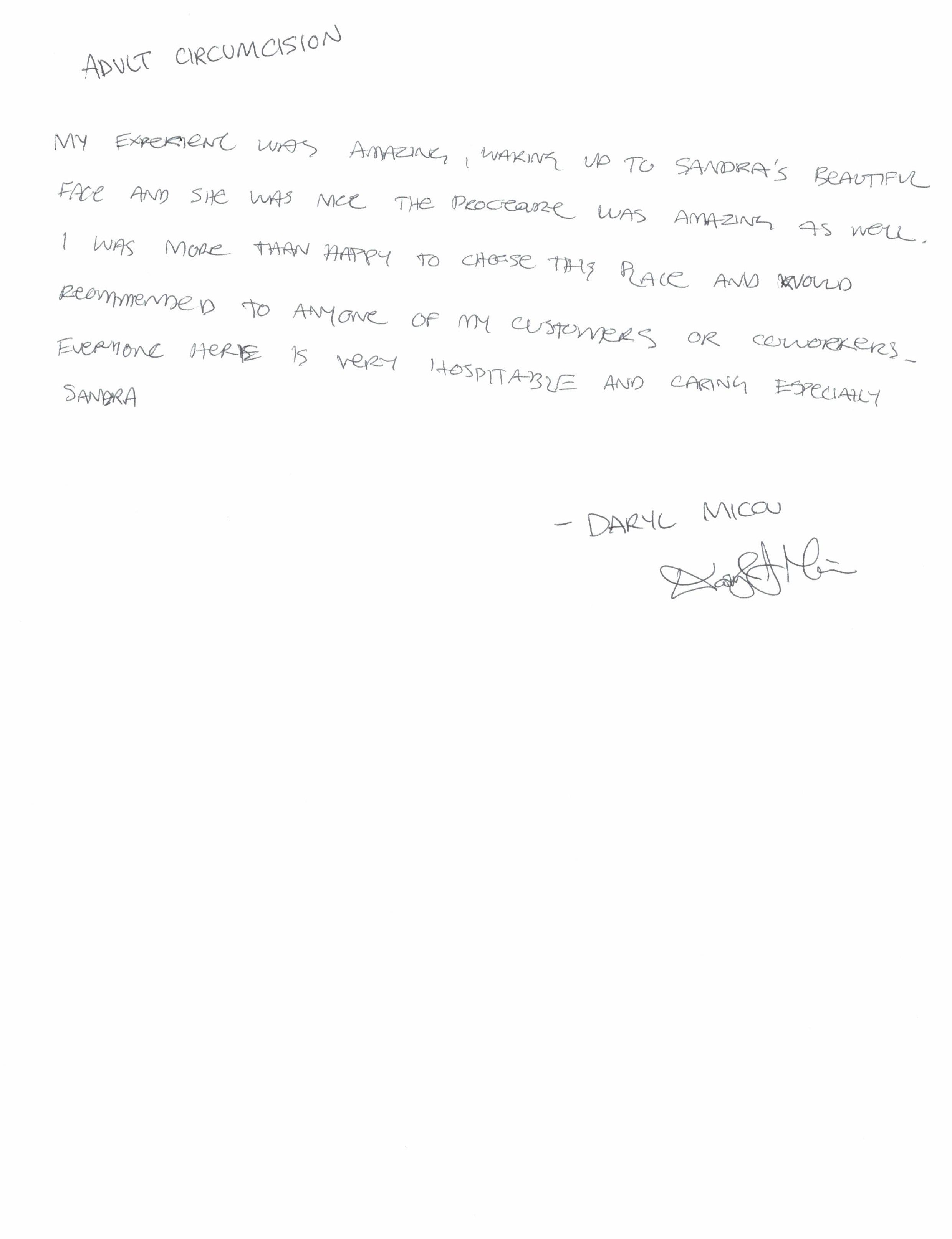 Thank you for the great experience. I was very afraid before surgery. I wanted to done circumcision for many years but everywhere I called all wanted so much money and to do procedure under local anesthesia.